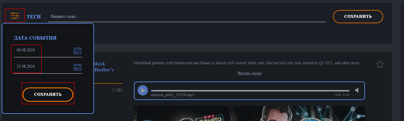 Вызов фильтра происходит при нажатии по дате, настройки применяются по кнопке «Сохранить»