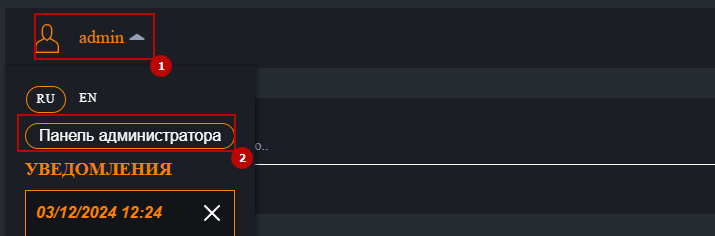 Вы можете перейти на панель администратора, открыв модальное окно по клику на свой username. Так же здесь находится панель для смены языка и уведомления.