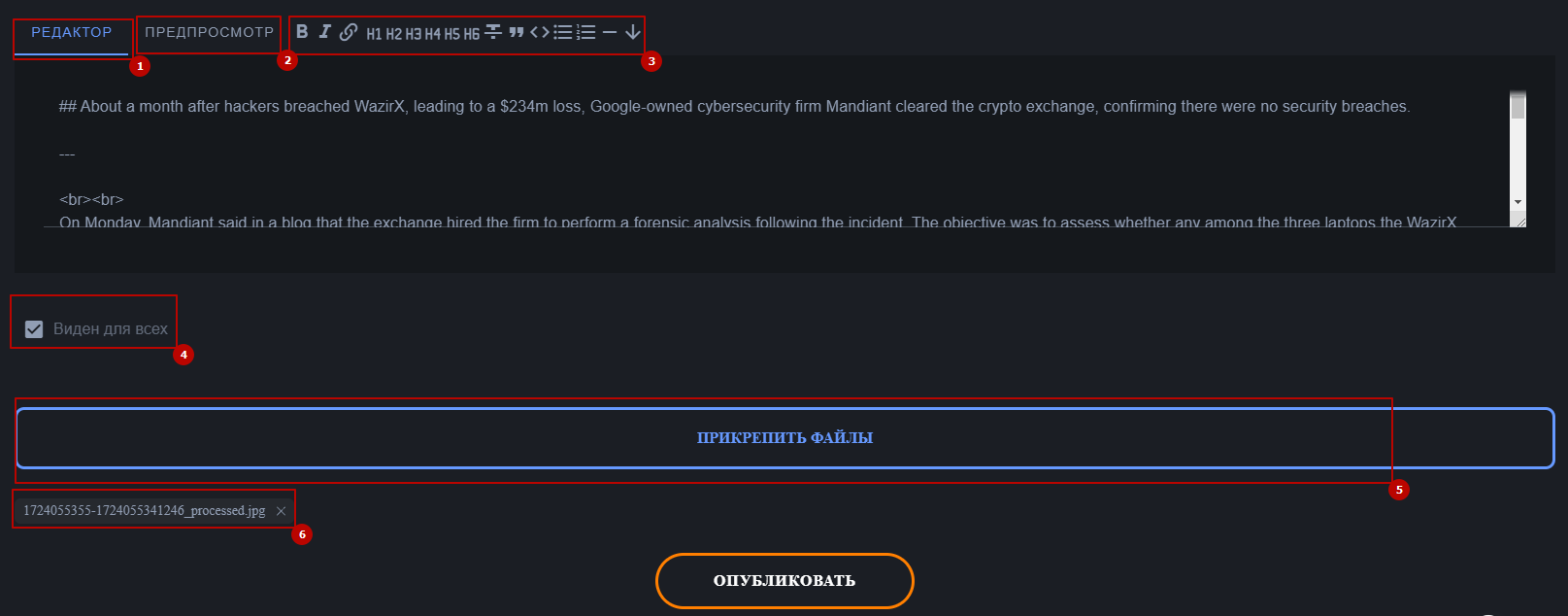 - Post Content Editor: This section allows you to add the main text of the post, with support for Markdown syntax. The maximum character limit is 10,000.